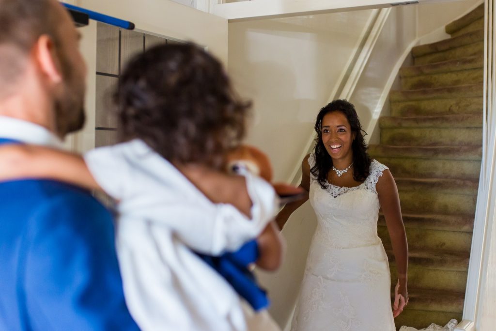 Dan is het moment daar dat jij en jouw partner elkaar voor het eerst die dag volledig klaargemaakt zullen zien! Hoe zien jullie dit moment voor je? Het is vaak een emotioneel moment, waar dikwijls ook al familie en vrienden bij zijn. Veel bruiden willen graag van de trap komen. Voor de foto’s is het dan belangrijk dat de ruimte voldoende licht en ruimte biedt. Als de ruimte klein en donker is raad ik aan de ontmoeting op een andere plek te doen. Denk bijvoorbeeld aan de woonkamer, tuin of voordeur. Maar het kan ook buitenshuis, bijvoorbeeld in een mooie straat, een park of op jullie trouwlocatie. Mocht je op zoek zijn naar meer inspiratie voor dit bijzondere moment raad ik je aan op Pinterest eens te zoeken naar ‘first look’.